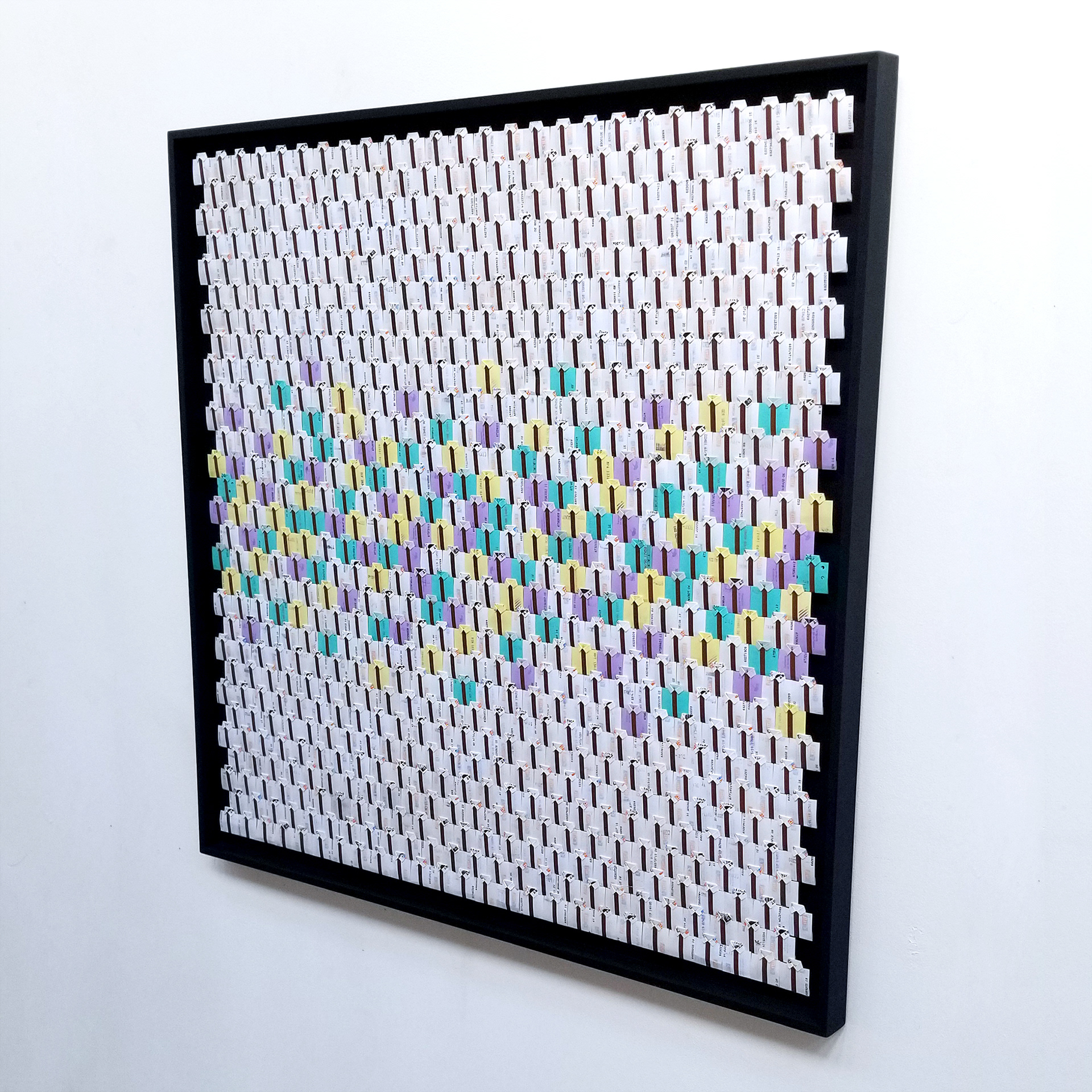 La disposition et le nombre de tickets de métro utilisés pour cet origami/collage de 82x82cm dépendent d'une date, le 14 juillet. Il est composé de 740 billets dont 147 de couleurs. 147 soit 3x49, ils sont disposés de manière horizontale et aléatoire par le centre. 7 de chaque couleur dans la ligne centrale et puis 6, 5, 4, 3, 2, 1, en 7 lignes par le haut et par le bas.