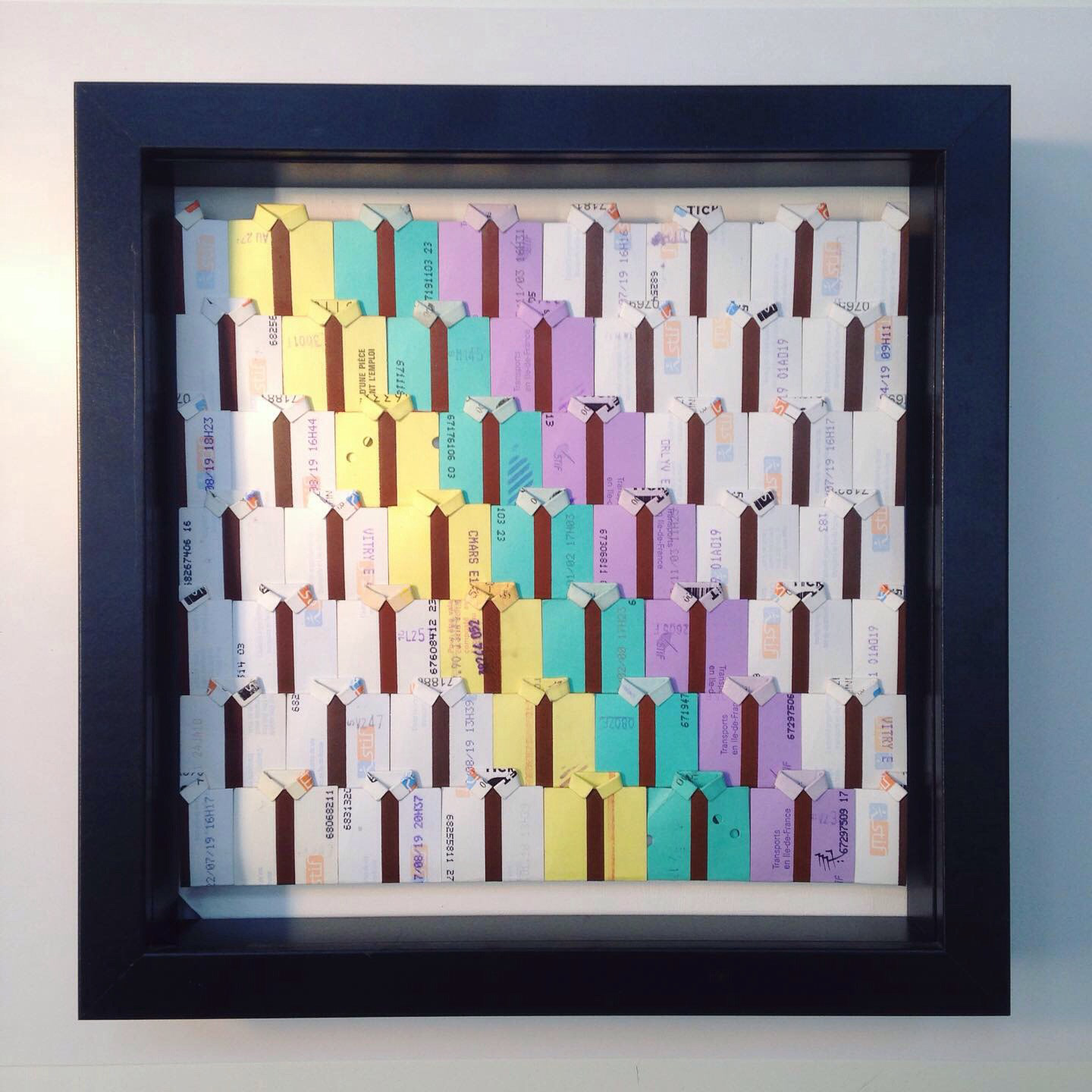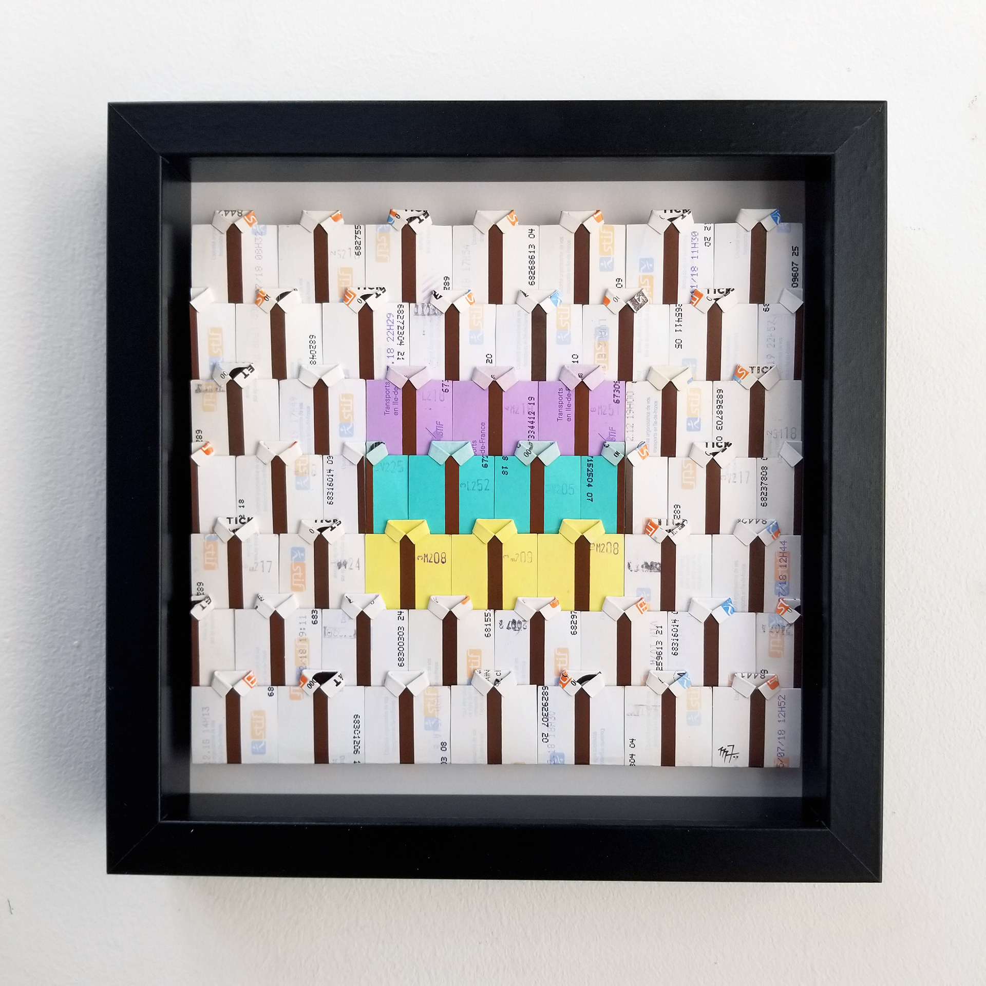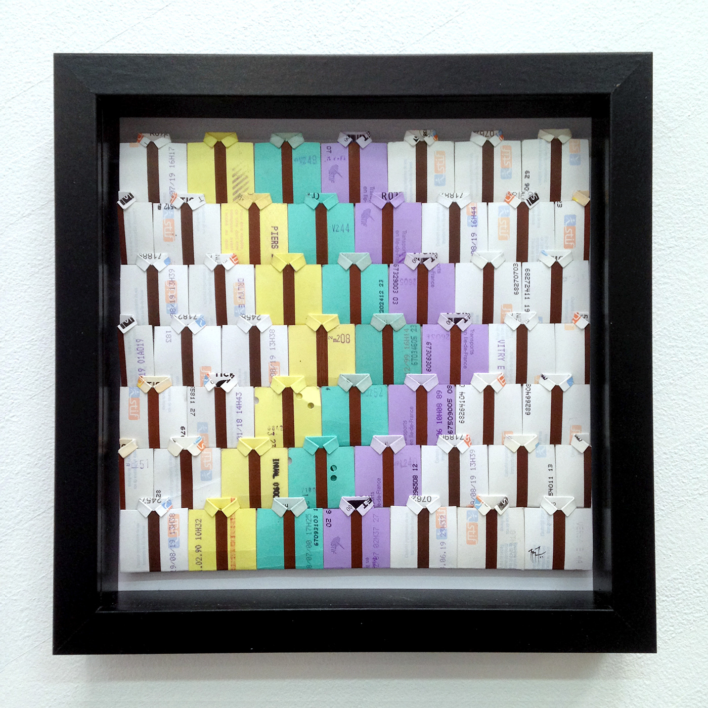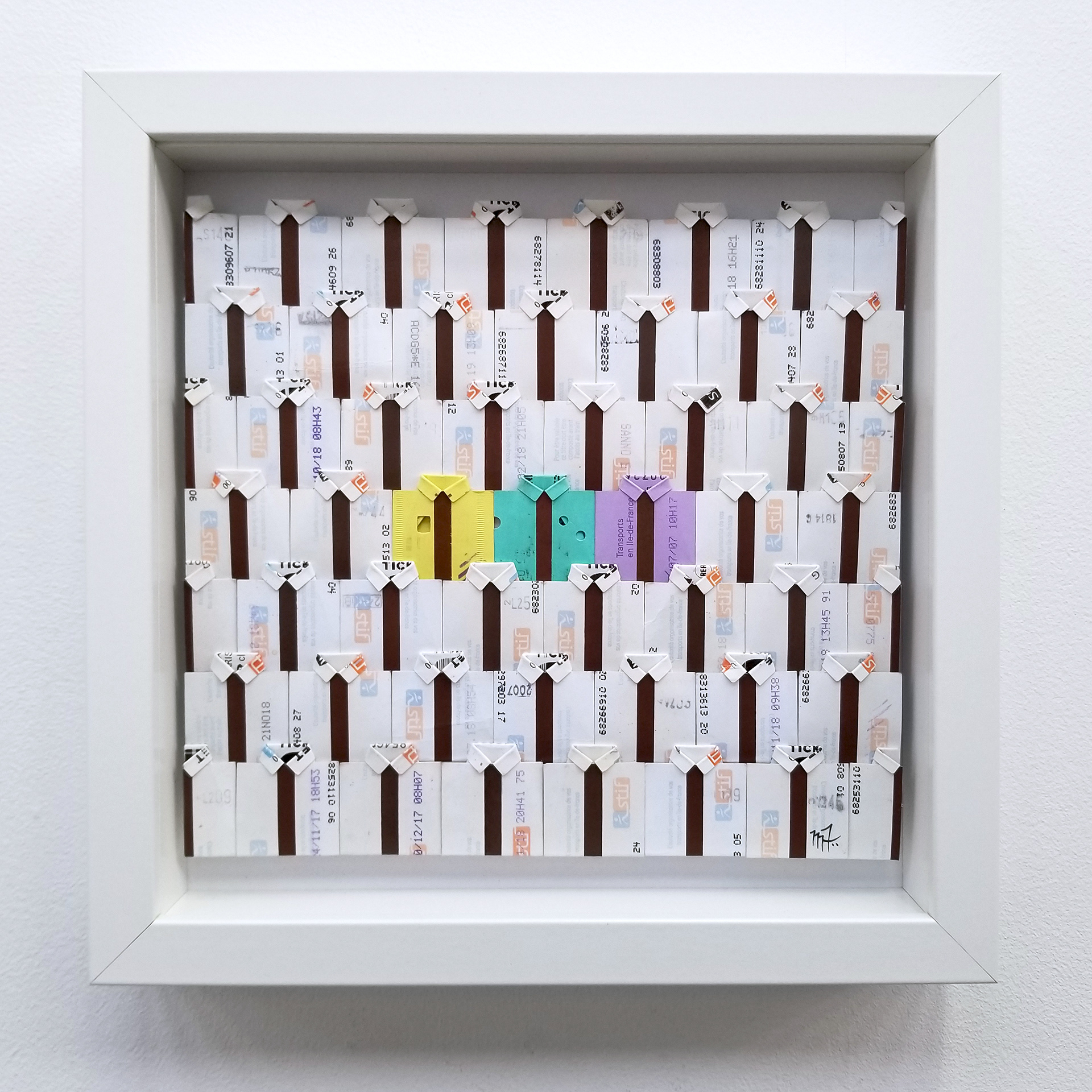 Série de petits formats (25x25cm) composés de tickets de métro parisien usagés pliés en origami et assemblés pour créer ce carré de 7x7 billets. On y retrouve les différentes périodes temporelles représentées par les couleurs.