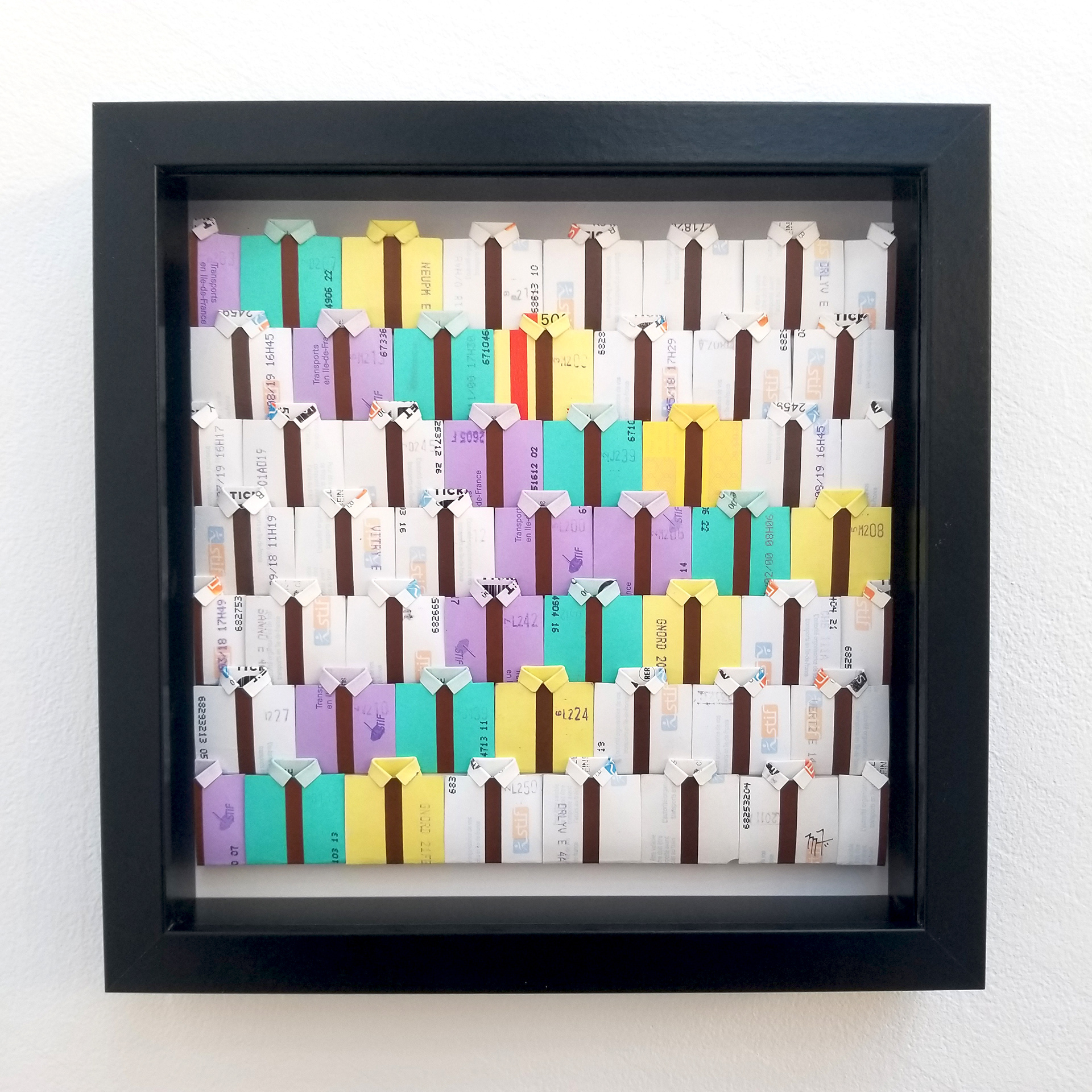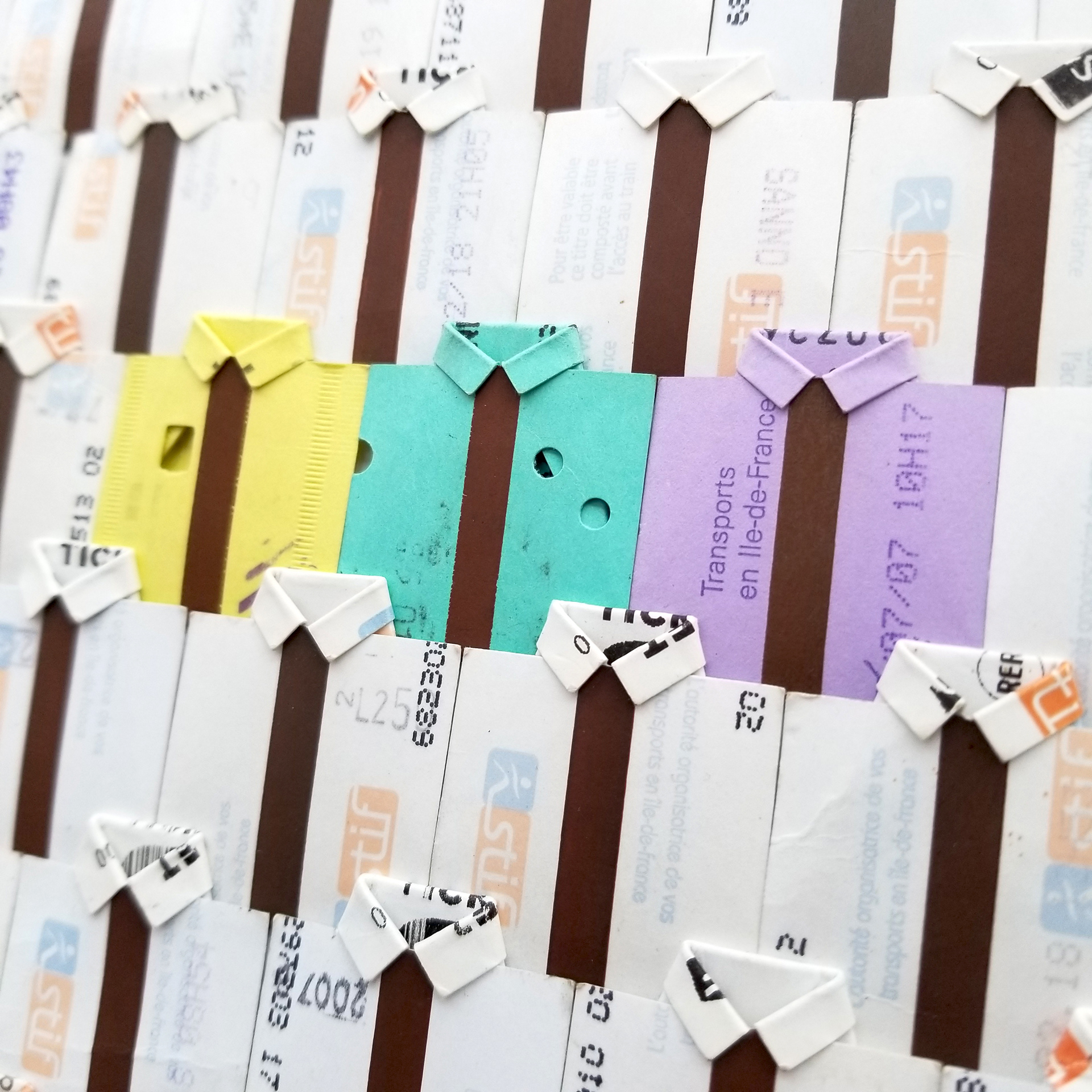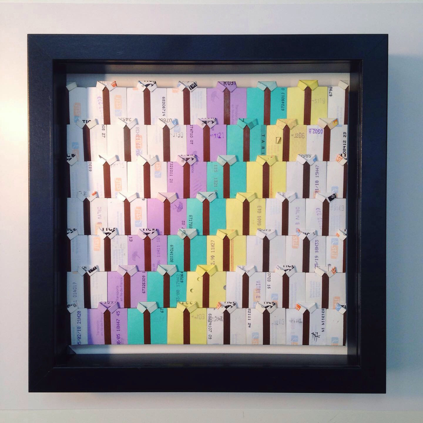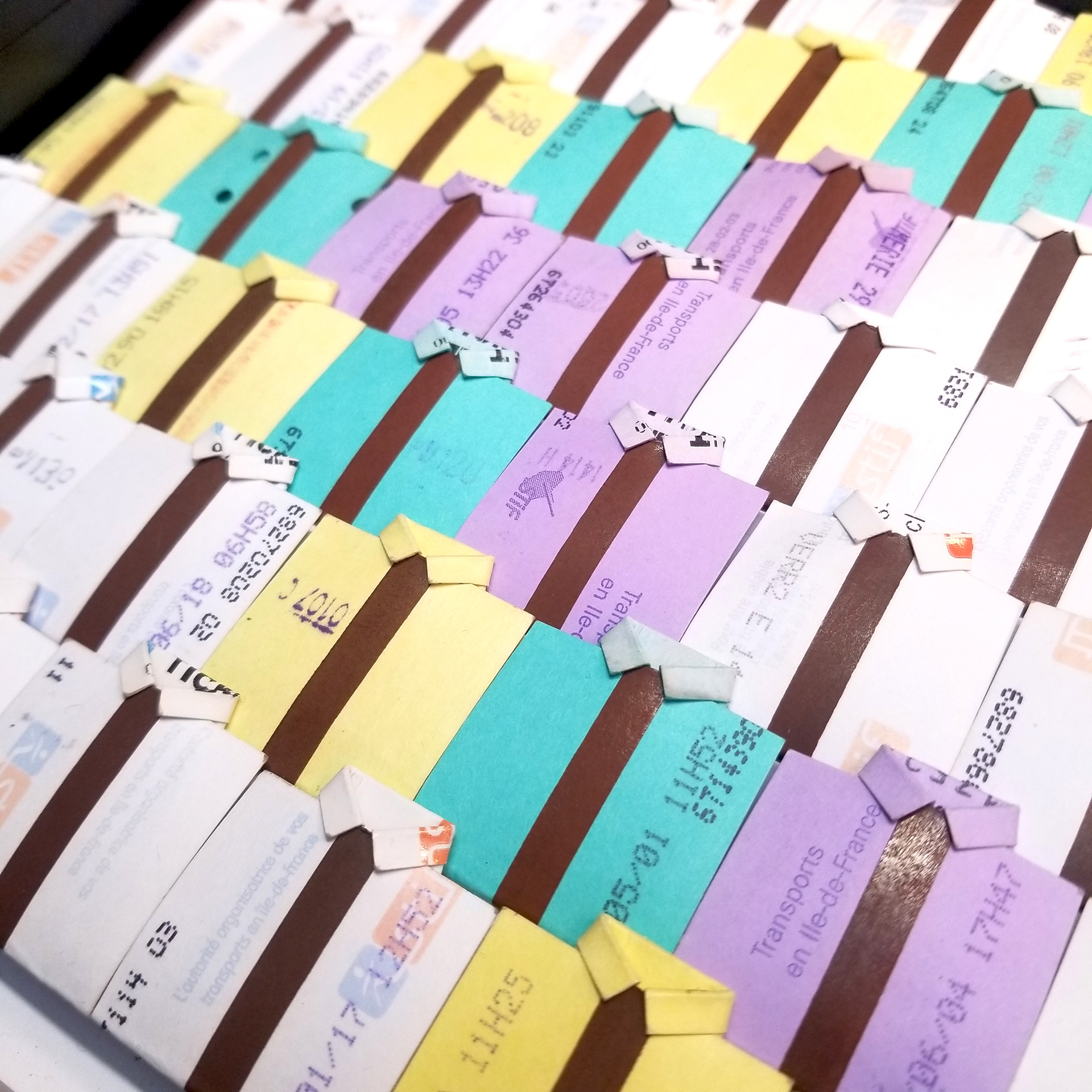 Série de petits formats (25x25cm) composés de tickets de métro parisien usagés pliés en origami et assemblés pour créer ce carré de 7x7 billets. On y retrouve les différentes périodes temporelles représentées par les couleurs.