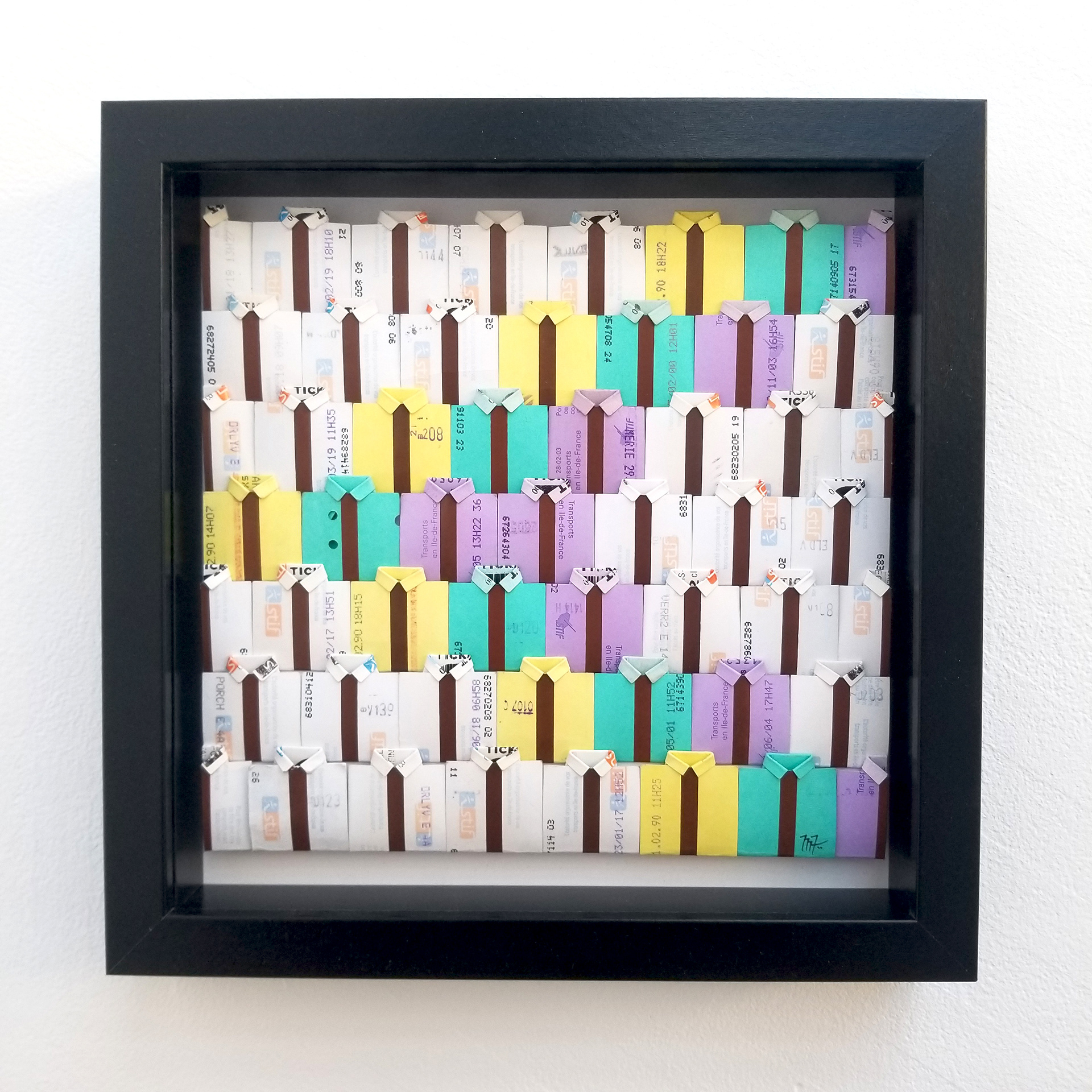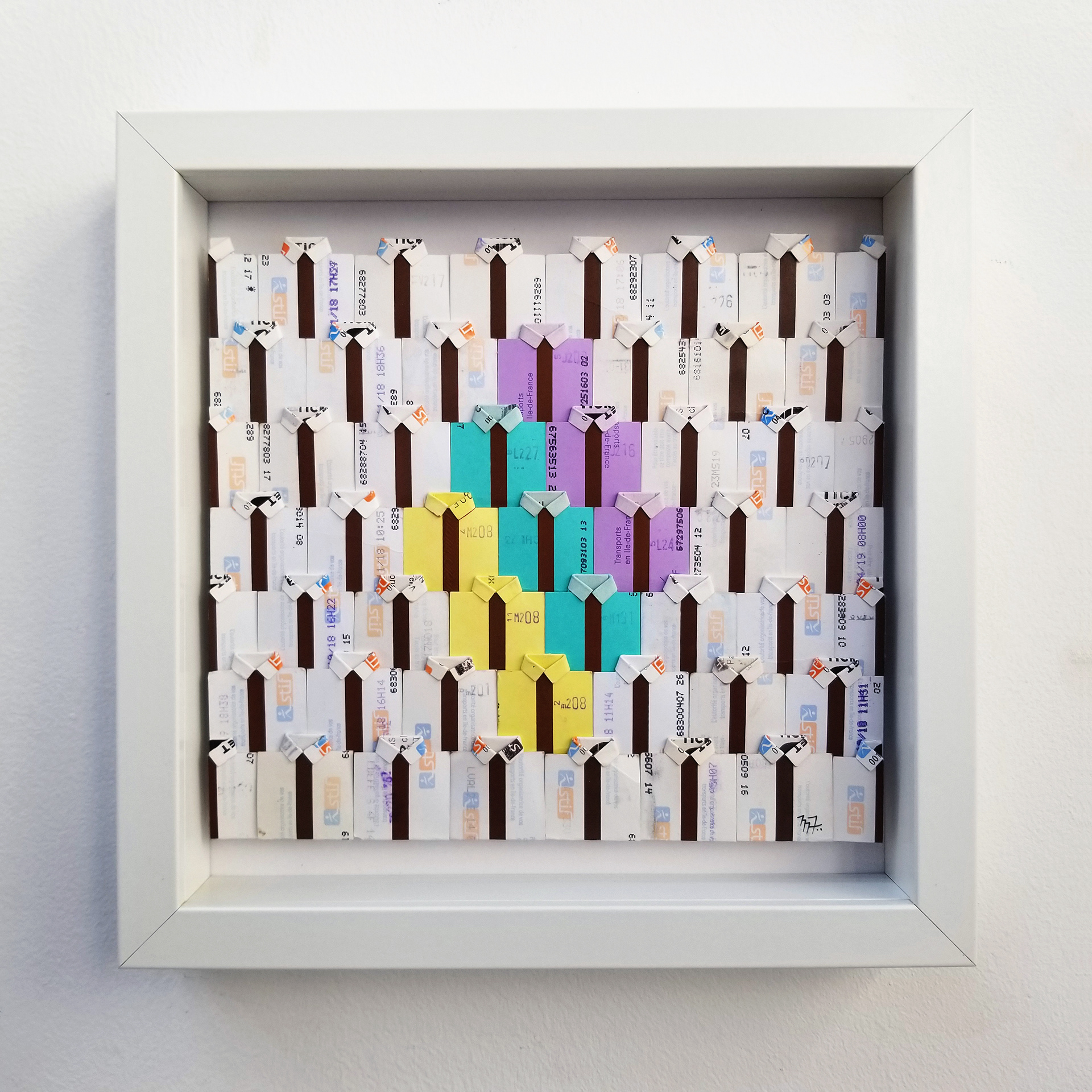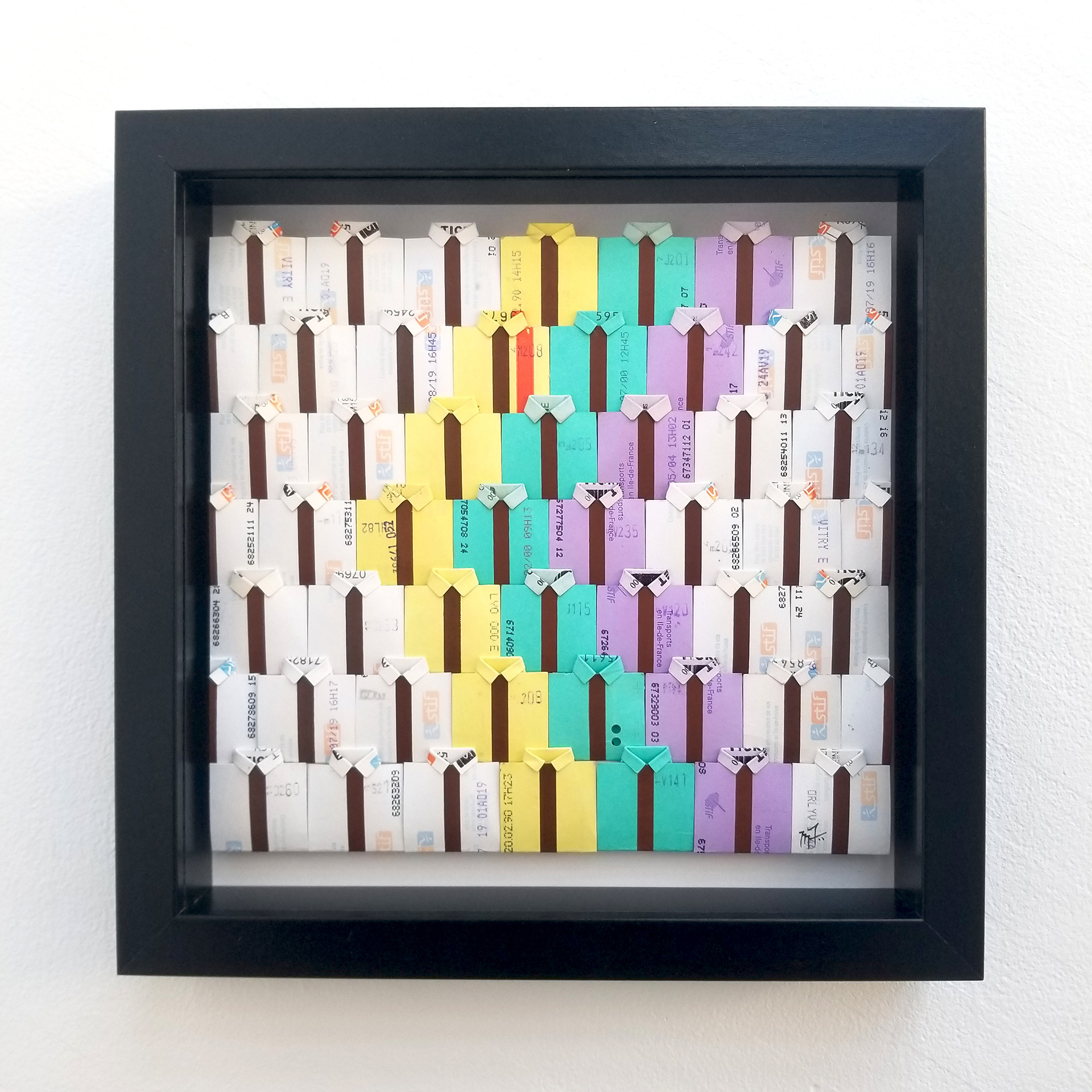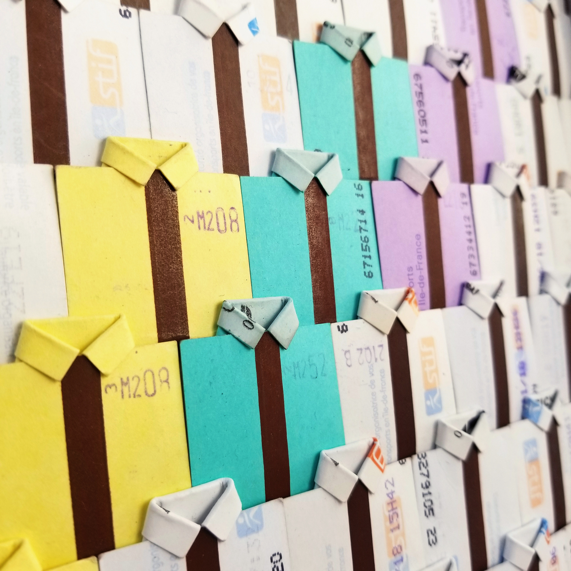 Série de petits formats (25x25cm) composés de tickets de métro parisien usagés pliés en origami et assemblés pour créer ce carré de 7x7 billets. On y retrouve les différentes périodes temporelles représentées par les couleurs.