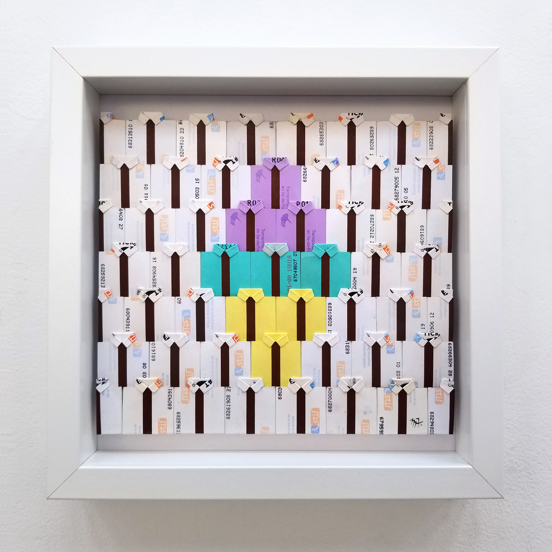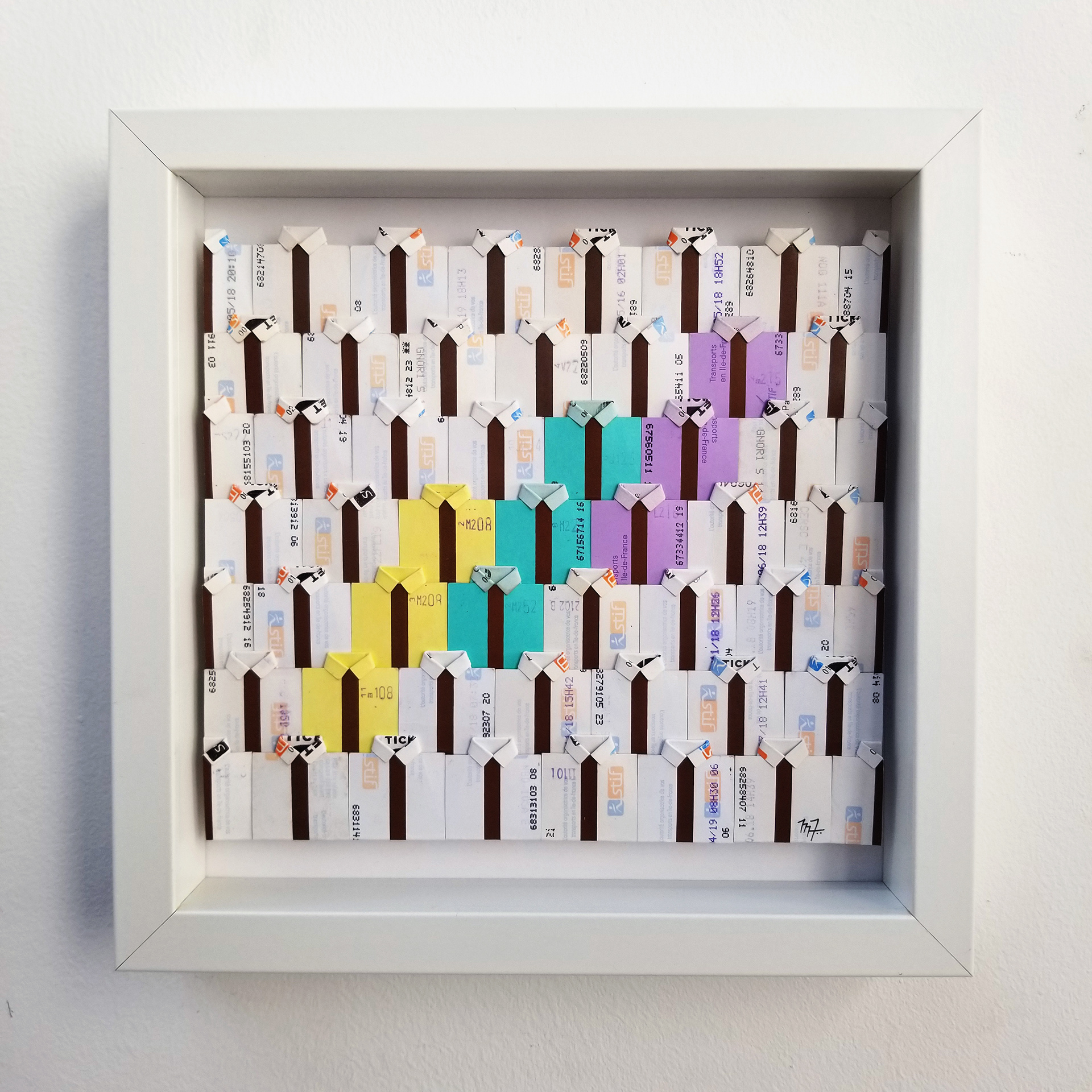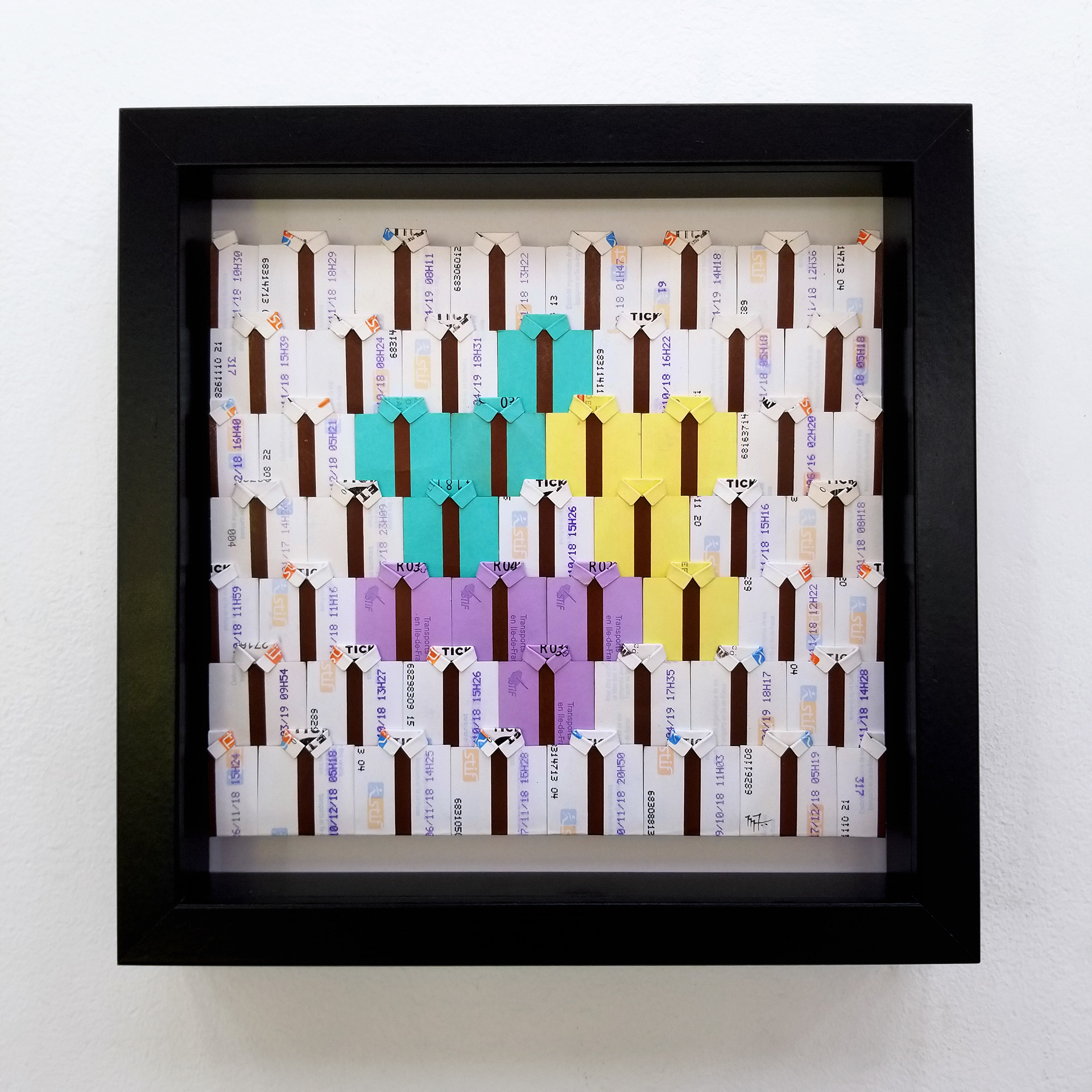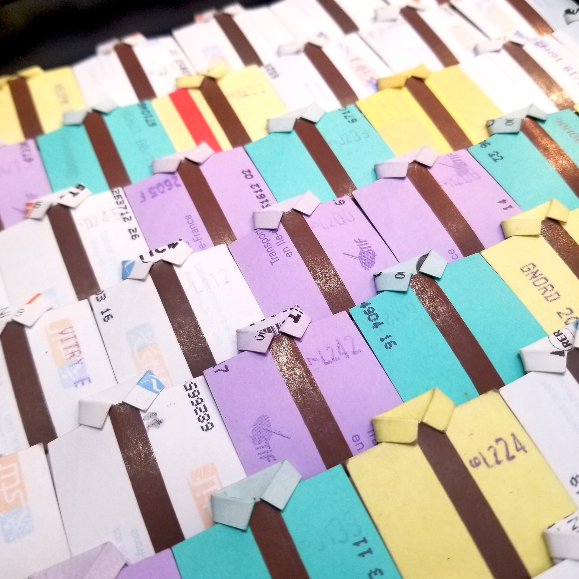 Série de petits formats (25x25cm) composés de tickets de métro parisien usagés pliés en origami et assemblés pour créer ce carré de 7x7 billets. On y retrouve les différentes périodes temporelles représentées par les couleurs.