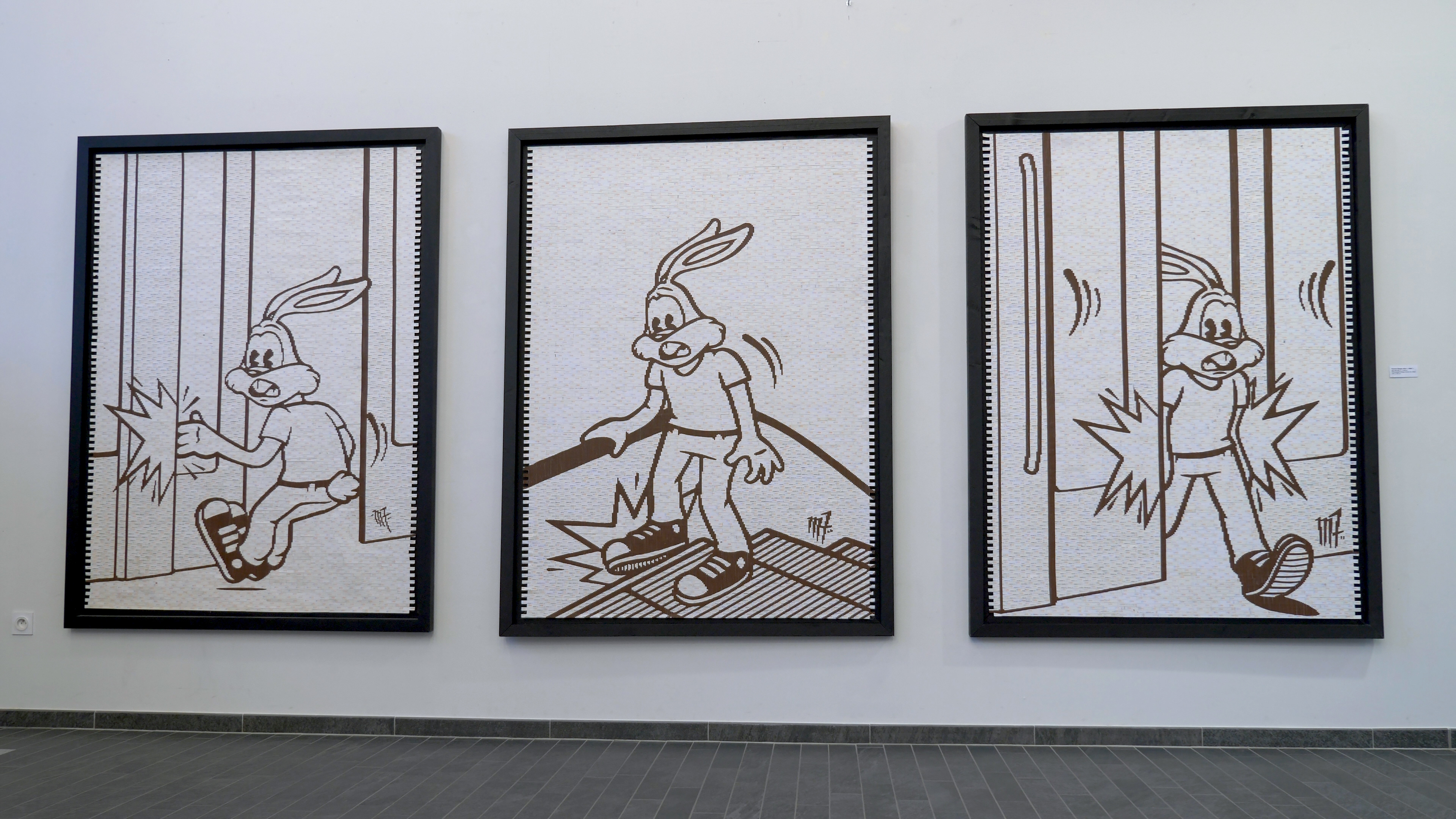 Ce triptyque géant représente les trois stickers qu'on peut voir dans les couloirs du métro parisien proches des portes automatiques et des escalators.
