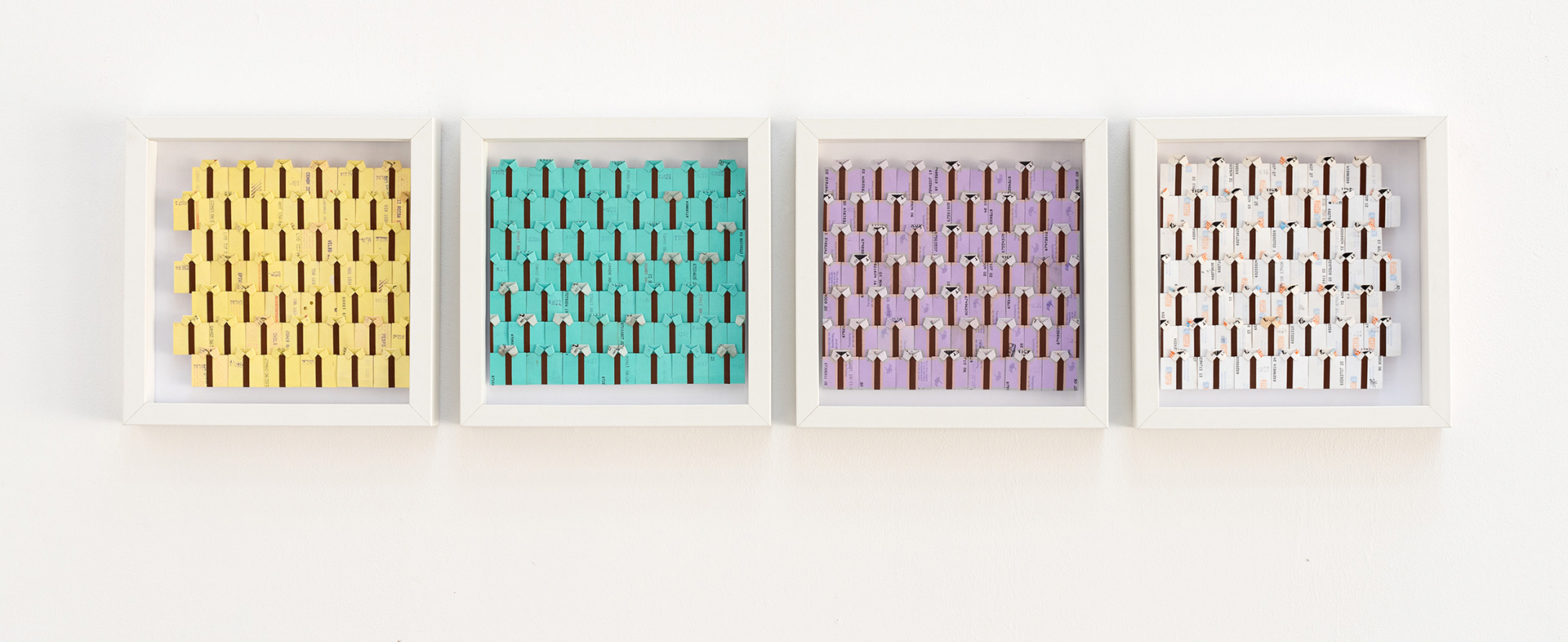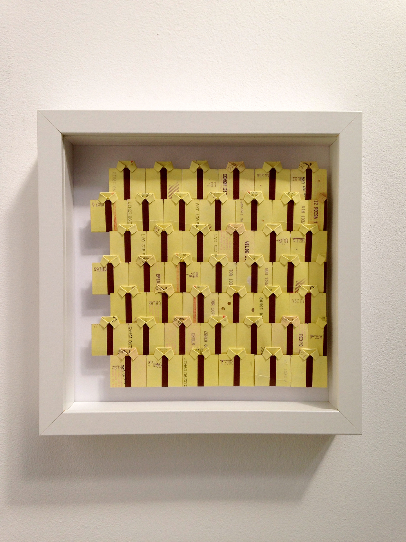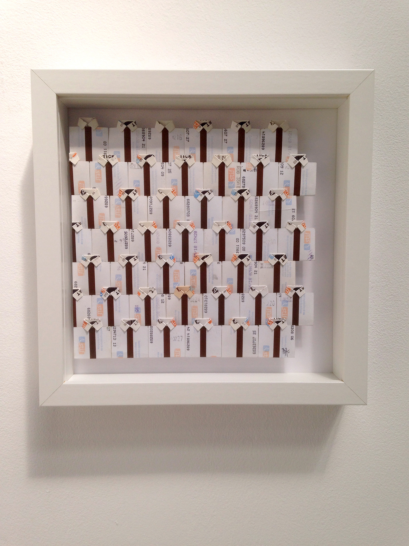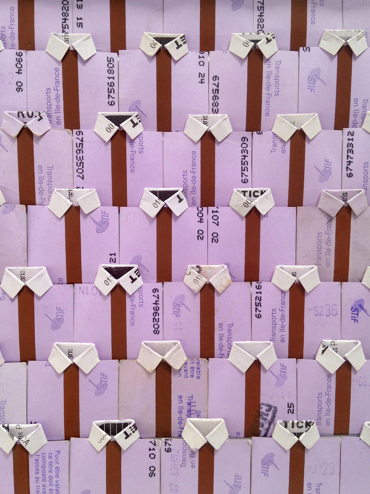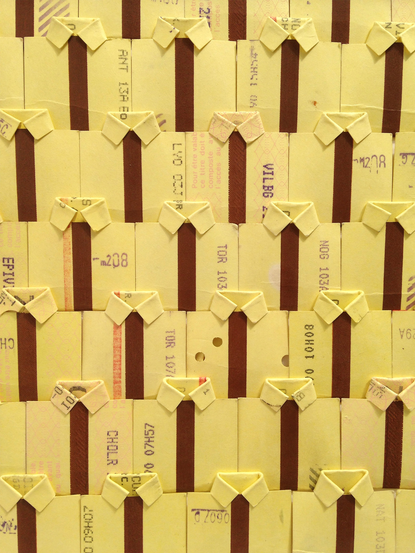 Quadriptyque (4x 23x23cm) réalisé en origami/collage à partir de tickets de métro parisien usagés.